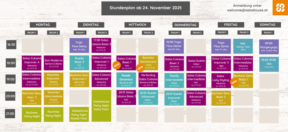 Bei SalsaHouse findest du den idealen Kurs, um Tanzen in Wien zu lernen oder deine Fähigkeiten weiter auszubauen. Ob Salsa, Bachata, Kizomba, Rueda de Casino oder Son Moderno – unser Stundenplan bietet dir alles, was du brauchst, um deinen Tanzstil zu perfektionieren und dabei Spaß zu haben.